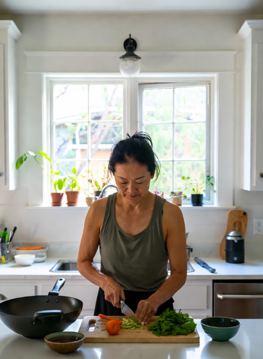 I made Fumiko's gomaae — sesame spinach, the five-minute side dish that is perfection in simplicity. Blanch the spinach. Squeeze out the water. Toss with ground sesame and soy sauce. Five minutes. Three ingredients. One perfect dish. The gomaae has not changed in thirty years — Fumiko's version and my version are indistinguishable, which means the recipe has been perfectly transmitted, which means the teaching was successful, which means the dead can still produce perfect food through the hands of the living, which is the closest thing to immortality that cooking can offer.