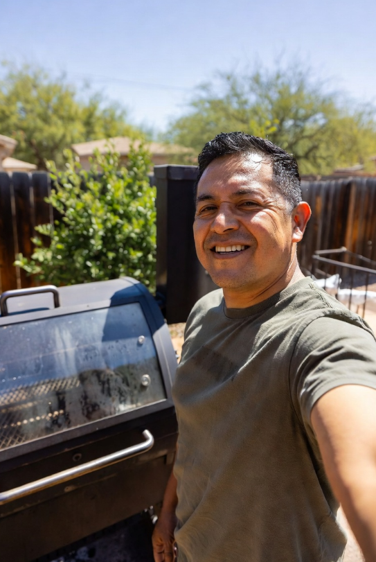 I am standing at the altar at dawn. The coals are catching. The coffee is too hot. The desert is blooming. The kids are asleep. Jessica is awake — she is always awake when I am at the grill, watching from the kitchen window, making sure the fire does not take the cook. The architect's rendering glows in the early light. Roberto's photograph — the one from the early 2000s, young Marcus on a milk crate at the cinder block grill — hangs next to it. Past and future, side by side, above the smoker, in the morning light.